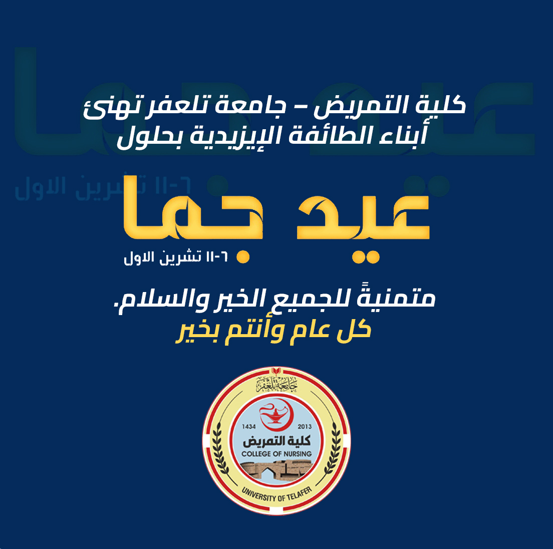 تتقدم كلية التمريض – جامعة تلعفر، متمثلةً بعميدها الأستاذ المساعد الدكتور إحسان حسن زينل، بأحر التهاني وأطيب التبريكات إلى أبناء شعبنا من الطائفة الإيزيدية بمناسبة حلول عيد الجماعية (عيد جما)، سائلين المولى عزّ وجل أن يعيده على الجميع بالخير واليُمن والبركات، وأن يحفظ عراقنا العزيز وأهله الكرام وينعم عليهم بالأمن