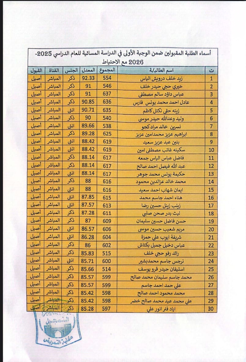 تُعلن كلية التمريض / جامعة تلعفر عن أسماء الطلبة المقبولين في الوجبة الأولى للدراسة المسائية للعام الدراسي (2025–2026)، وعلى الطلبة المدرجة أسماؤهم مراجعة شعبة التسجيل في الكلية ابتداءً من يوم الأحد الموافق 9 / 11 / 2025، لغرض استكمال إجراءات التسجيل وتقديم المستمسكات المطلوبة. المستمسكات المطلوبة للتسجيل: البطاقة الوطنية الموحدة