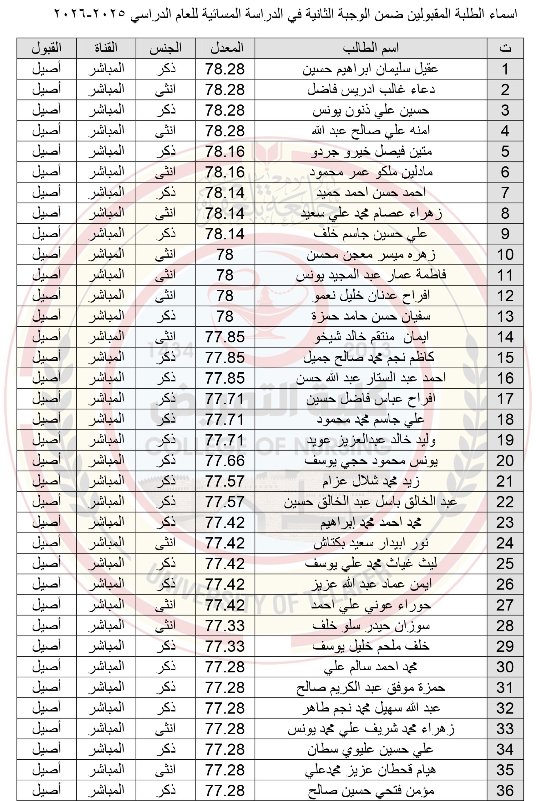 تُعلن كلية التمريض / جامعة تلعفر عن أسماء الطلبة المقبولين في الدراسة المسائية للعام الدراسي (2025–2026) – الوجبة الثانية. وعلى الطلبة المدرجة أسماؤهم مراجعة شعبة التسجيل في الكلية ولمدة يومين فقط ابتداءً من يوم غدٍ الاثنين الموافق 17 / 11 / 2025 ولغاية الثلاثاء 18 / 11 / 2025، لغرض استكمال إجراءات التسجيل وتقديم المستمسكات المطلوبة.