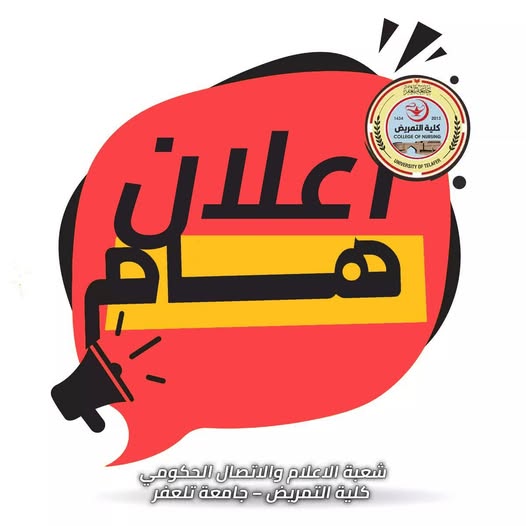 تدعو عمادة كلية التمريض في جامعة تلعفر جميع الطلبة الأعزاء إلى ضرورة تسديد الأقساط الدراسية ضمن المدة المحددة، وذلك لضمان استمرار الإجراءات الدراسية وتجنب أي إيقاف إداري قد يؤثر في المسيرة الدراسية للطالب.