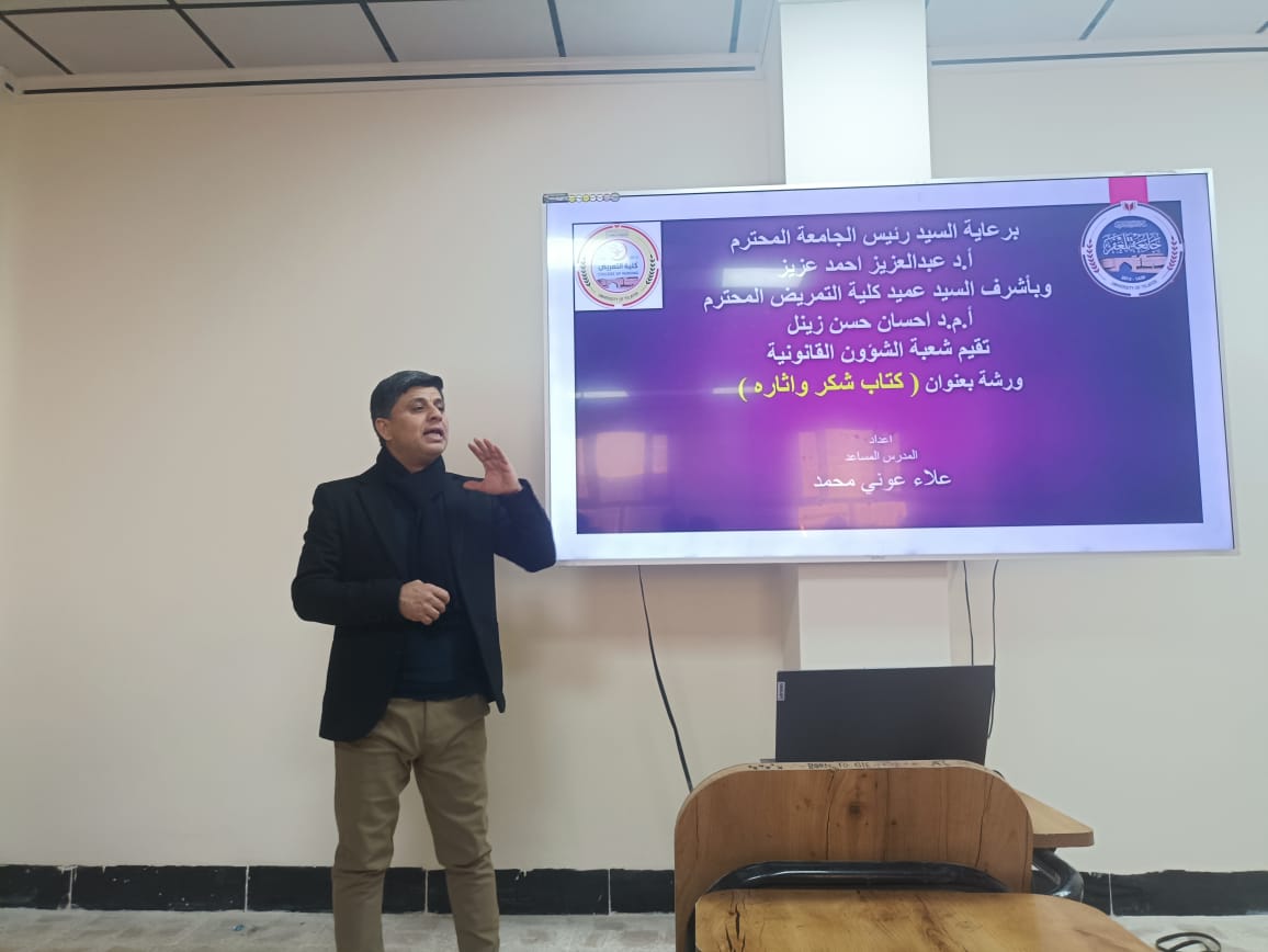 بإشرافٍ مباشر من قبل السيد عميد كلية التمريض الأستاذ المساعد الدكتور إحسان حسن زينل، نظّمت شعبة الشؤون القانونية في كلية التمريض ورشة عمل متخصصة بعنوان: